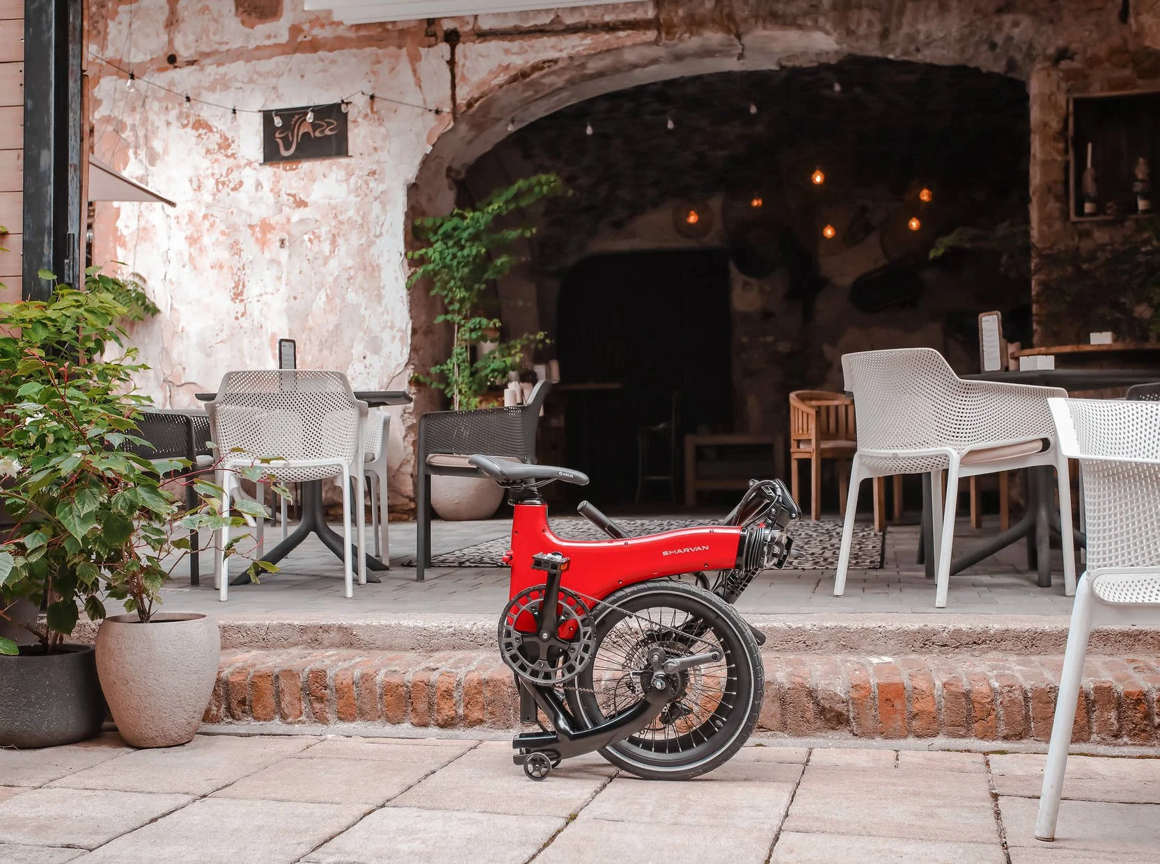 After finishing your ride, fold the Sharvan in just three simple moves to a compact size of 60 x 66 x 40 centimetres. Then you can easily store it in your car trunk, your flat, your office, or wherever. Fold it in less than thirty seconds.